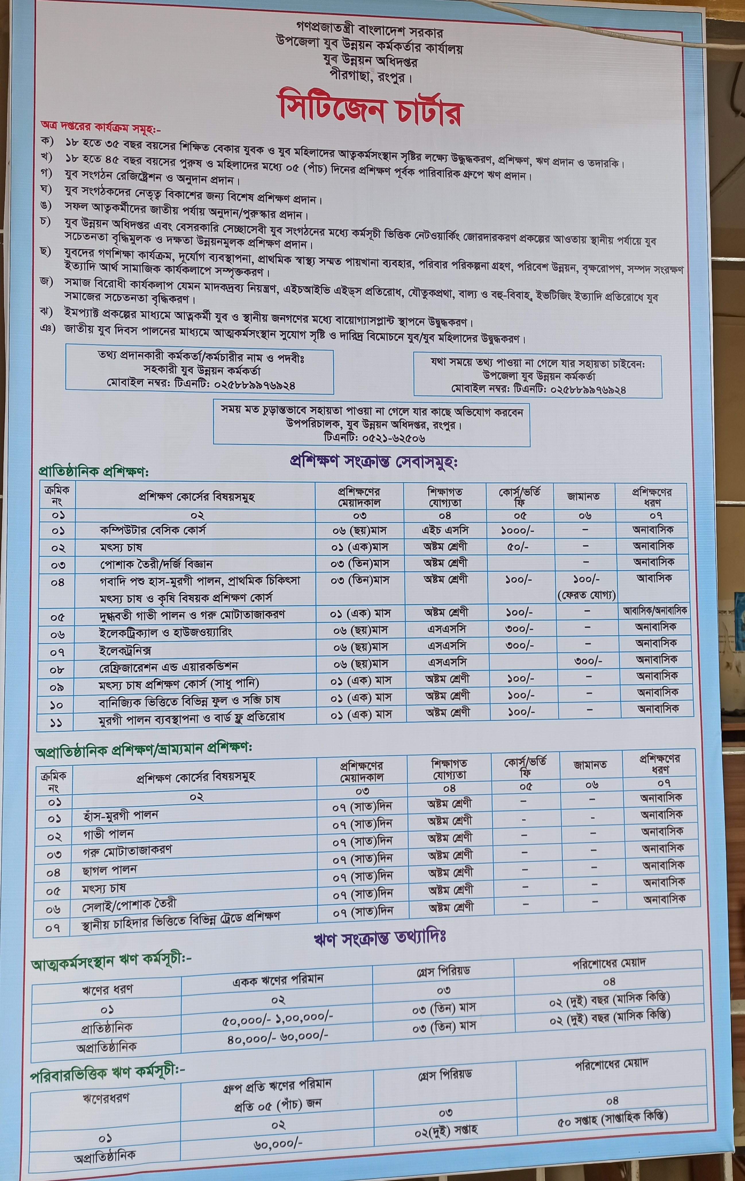 | | তিন মাস মেয়াদী গবাদিপশু, হাঁস মুরগী পালন ও উহাদের প্রাথমিক চিকিৎসা এবং মৎস্য চাষ ও কৃষি বিষয়ে প্রশিক্ষণ কোর্স | উপজেলা কার্যালয়ে আবেদনপত্র জমা দেওয়ার পর মহা-পরিচালকের কার্যালয়/উপ-পরিচালকের কার্যালয় হইতে নির্দেশিত তারিখের মধ্যে প্রশিক্ষণের জন্য পাঠানো হয়। | বয়স (১৮-৩৫) বৎসরের মধ্যে নূন্যতম অষ্টম শ্রেণী পাশ বেকার যুবক ও যুব মহিলা প্রশিক্ষণে আগ্রহী প্রার্থীগণ উপজেলা কার্যালয়ে আবেদন করবেন উপজেলা কার্যালয় আবেদন পত্রগুলি যাচাই বাছাই করে জেলা কার্যালয়ে প্রেরণ করবেন। অতঃপর জেলা কার্যালয় কর্তৃক নির্ধারিত তারিখে আবেদনকারীগণের স্বাক্ষাৎকার নিবেন। স্বাক্ষাৎকারেরমাধ্যমে যারা চূড়ান্তভাবে নির্বাচিত হবেন তারাই প্রশিক্ষণে ভর্তি হতে পারবেন। |